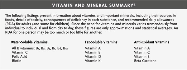 Because each of us is different, it is impossible to set absolute standards for all. The charts below list the essential vitamins and minerals and tell what they are needed for and where to find them. It is important to note, however, that the minimum daily requirements (MDR) and recommended doses are merely averages. They are based on minimal amounts needed to prevent serious disease, not the amount that those seeking high-level wellness may wish to use. Also, keep in mind that while the meats, fish, grains, fruits, and vegetables listed in this table supply certain vitamins and minerals, you should always seek out foods that are organically grown or farmed, to avoid toxicity.