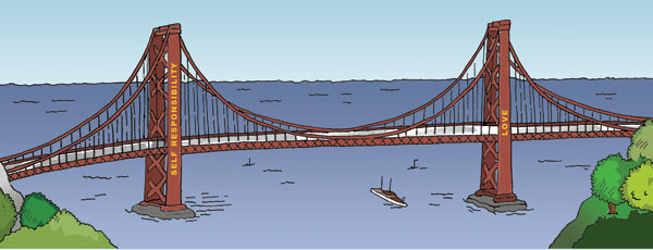 Self-responsibility and love establish a life-context in which freedom and flexibility are naturally occurring states of being. They are primary expressions of life energy. Self-responsibility and love together form the foundations of wellness and encourage the free flow of all other types of energy. If either principle (or pier) is weakened, living harmoniously (or traversing the bridge) becomes more difficult. When both are strong, energy dances back and forth, and the crossing is easy.
